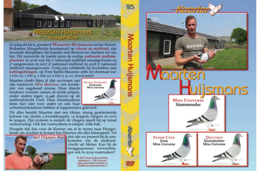 Zo jong als hij is, presteert Maarten Huijsmans uit het Noord-Brabantse Hoogerheide fenomenaal op vitesse en midfond, zijn favoriete disciplines: hij beperkt zich bewust tot vluchten tot 500 km. Hij veroverde de laatste jaren de nodige nationale podiumplaatsen: in 2016 was hij 1e nationaal midfond onaangewezen en 2e aangewezen; in 2017 2e nationaal midfond; in 2018 3e nationaal midfond onaangewezen. Vorig jaar schitterde hij bovendien met kettinguitslagen, op Pont Sainte-Maxence zelfs tot driemaal toe: 3 t/m 10; 1 t/m 4, 7 t/m 10; 2 t/m 5, 9, 10, enzovoorts!